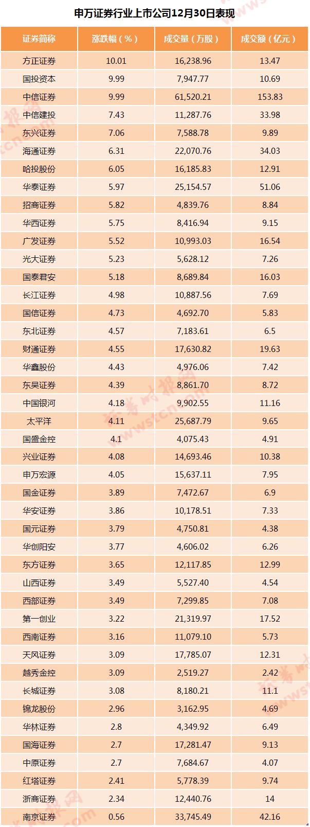 行情数据显示,申万证券行业43家上市公司股票全线上涨,其中涨幅超过5%的就多达13只。