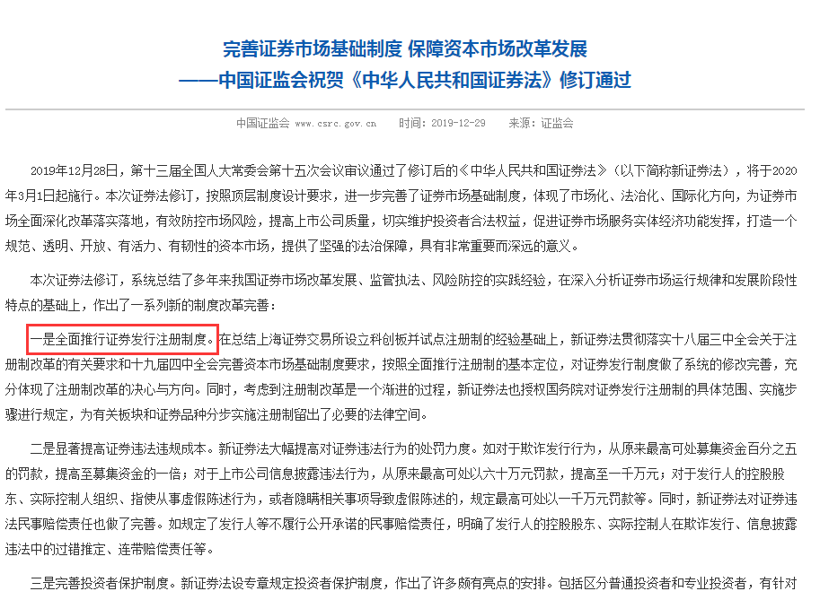 2019年12月28日,第十三届全国人大常委会第十五次会议审议通过了修订后的《中华人民共和国证券法》,将于2020年3月1日起施行。其中一项重大的制度改革便是全面推行证券发行注册制度。