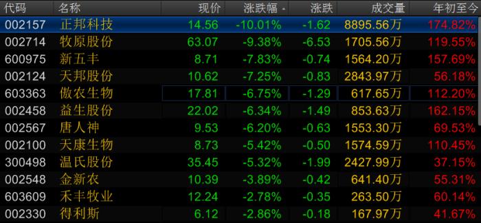 9月26日,猪肉股大跌。至发稿前,申万农林牧渔板块跌幅达4.32%,猪肉股龙头正邦科技跌停,牧原股份跌9.77%,新五丰、天邦股份跌幅均超过7%,清一色是前期的强势股。
