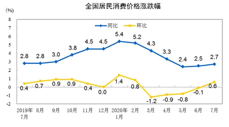 国家统计局今日上午公布数据显示,7月CPI同比上涨2.7%,涨幅比上月扩大0.2个百分点。这是CPI同比连续第二个月反弹。