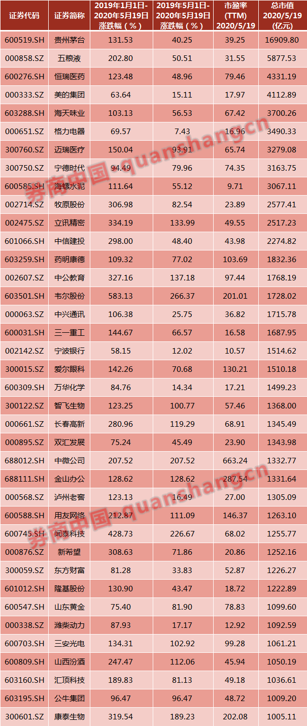 据券商中国记者统计,这些股票在过去一年当中(从去年5月1日至今年5月19日,以下同)加权平均涨幅接近200%,而加权平均市盈率(TTM)更是超过了124倍。此外,过去一年当中,涨幅超过1倍的股票达146只,截至5月19日,这些股票市值全部超过100亿,其中超过1000亿的有12只,超过500亿的有32只,其平均市盈率已经达到108倍。此外,还可以看到,在过去一年当中,不少大市值股票涨幅惊人。