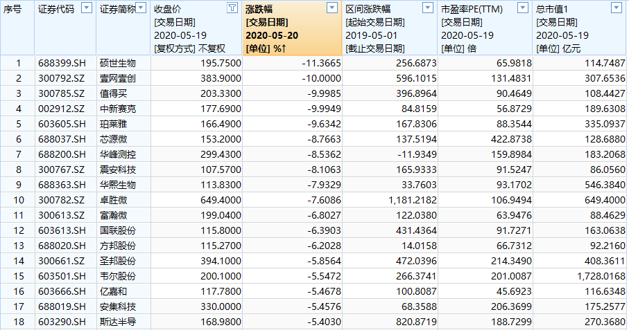 5月20日,一大波高价股高位杀跌。据券商中国记者统计,截至5月19日这样一个特别的日子,A股市场股价突破100元的上市公司达83只,但这83只股票有不少在20日的行情中损失惨重。其中此前猛涨的硕世生物大跌11.37%,壹网壹创、值得买、中新赛克跌停,珀莱雅、芯源微、华峰测控等股票跌幅皆超8%。
