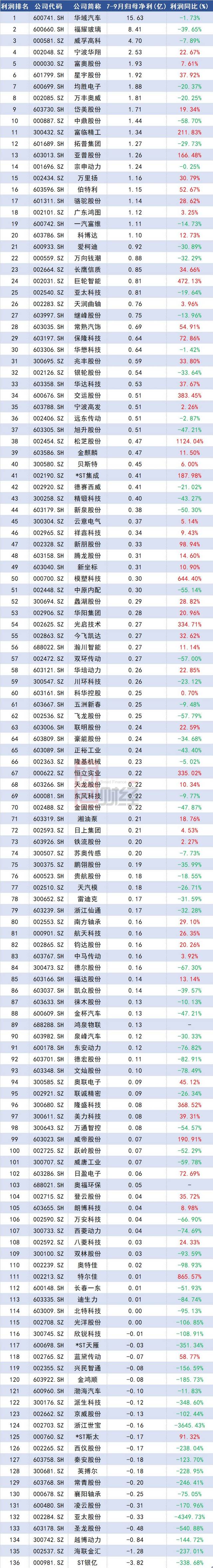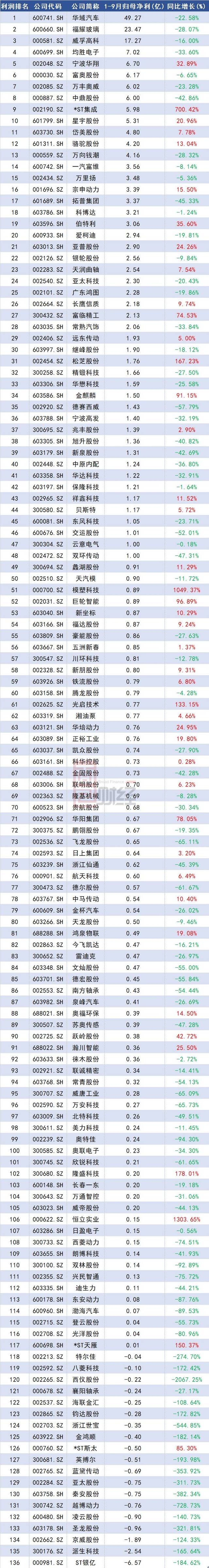 增速来看,前三季度有43家配件企业归母净利润同比增长,其中增长最快的是恒立实业,增幅约1303.65%;其次是模塑科技(3.600, -0.08,-2.17%)(000700.SZ),增幅约1049.37%。93家企业归母净利润同比下滑,占比近7成。以下是136家公司前三季度归母净利润及同比变动情况: