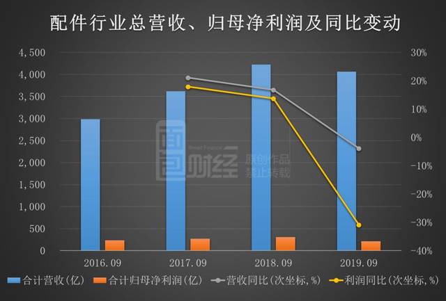 图表显示在经历了2016至2018年的连续增长后,2019年前三季度配件行业整体营收及归母净利润均出现回落,且利润降幅高于营收降幅。这一定程度上反映出当前车市下行,配件企业普遍面临着较大的降价压力。