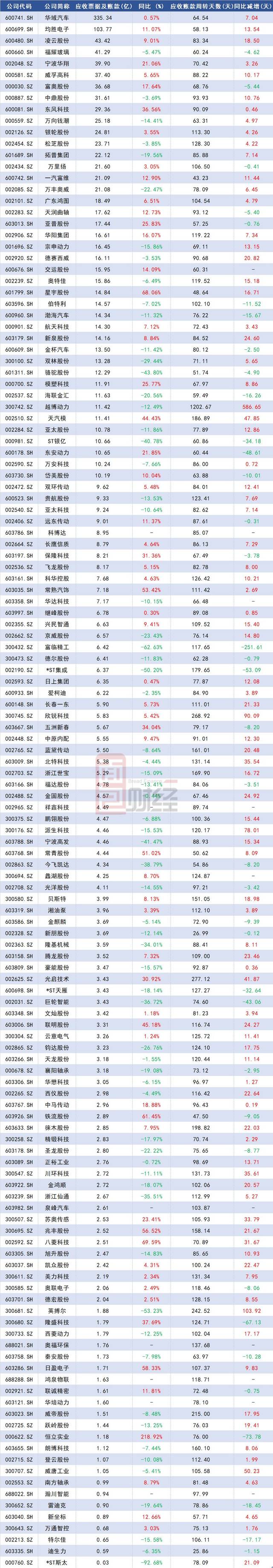 单家企业数据来看,截止2019年三季度末应收票据及账款最高的是华域汽车,金额约335.34亿。除7家企业去年同期数据不可查询外,剩余129家配件企业中,应收票据及账款同比增长的企业有62家,接近5成;其中增长最多是恒立实业,增幅约218.92%。以下是136家企业截止2019年9月30日的应收票据及账款,以及周转天数具体情况: