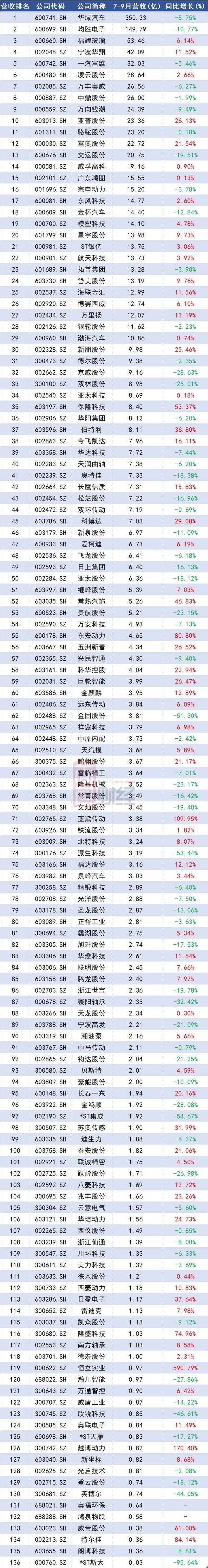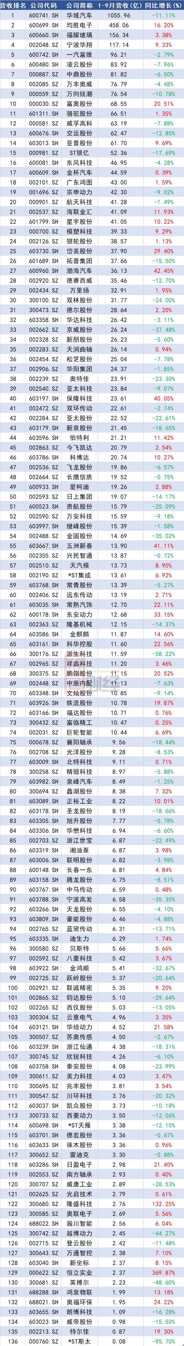 从营收增速来看,前三季度有63家配件企业营收同比增长。其中,恒立实业(000622.SZ)以369.87%的增幅列居首位。此外营收倍数增长的还有隆盛科技(300680.SZ),增幅约132.25 %。73家企业营收同比下滑,占比半数以上。其中,营收金额排名第一的华域汽车,1-9月营收同比下滑11.11%,是4家营收超百亿企业中唯一收入下滑的。以下是136家企业前三季度营收及同比变动情况: