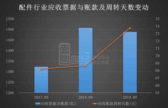 图表显示2019年前三季,配件行业的应收票据及账款规模回落,较上年同期减少约1.29%,但周转天数继续上行,周转率降至约3.66。