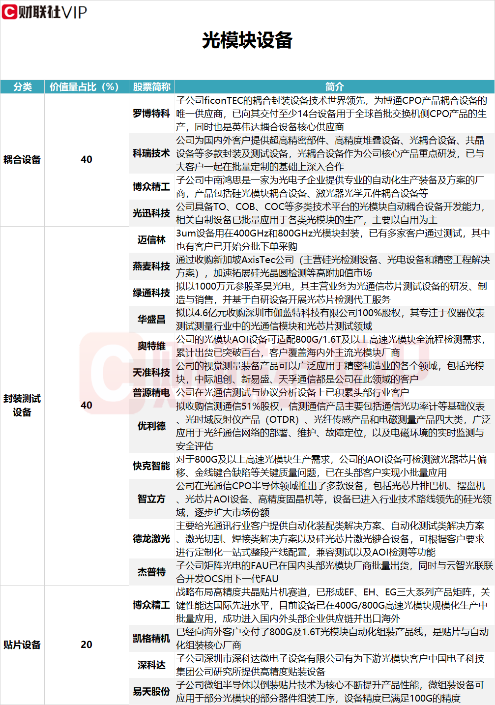 据财联社VIP盘中宝•数据栏目此前梳理,光模块设备主要分为三大类,包括价值量占比40%的耦合设备、价值量占比40%的封装测试设备以及价值量占比20%的贴片设备。耦合设备涉及的A股上市公司包括罗博特科、科瑞技术、博众精工、光迅科技;封装测试设备涉及的公司包括迈信林、燕麦科技、绿通科技、华盛昌、奥特维、天准科技、普源精电、优利德、快克智能、智立方、德龙激光、杰普特。具体情况详见下图: