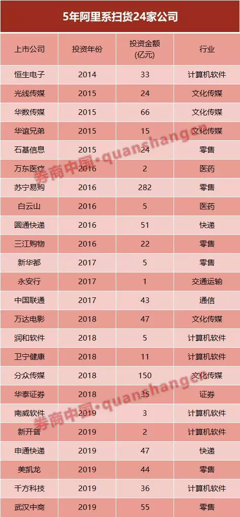 那么,阿里系在A股布局了哪些公司、哪些行业,收益如何呢?