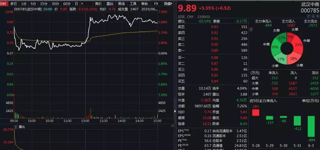 受此消息刺激,3日武汉中商大幅高开,不过早盘有所回落,午后大幅拉升,收盘大涨5.55%,报9.89元/股,盘面的博弈较为激烈,也反应了市场对此次居然之家借壳上市的分歧。