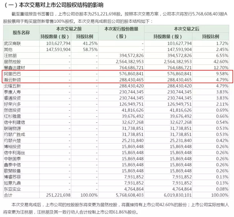 3日,武汉中商宣布,居然之家拟借壳武汉中商上市,作为二股东的阿里巴巴位列其中。此前,作为战略投资者,阿里巴巴向居然之家投资54.53亿元。交易完成后,阿里巴巴及其一致行动人瀚云新领将合计持有14.37%,为第二大股东。