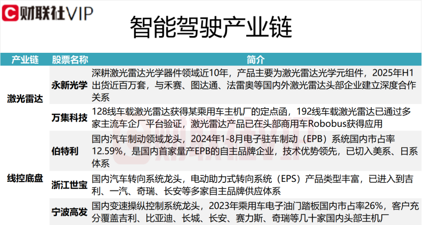 据财联社VIP盘中宝数据此前梳理,在智能驾驶产业链中,在激光雷达领域,涉及的A股上市公司有永新光学和万集科技;在线控底盘领域,涉及的A股上市公司有伯特利、浙江世宝和宁波高发。具体情况如下图: