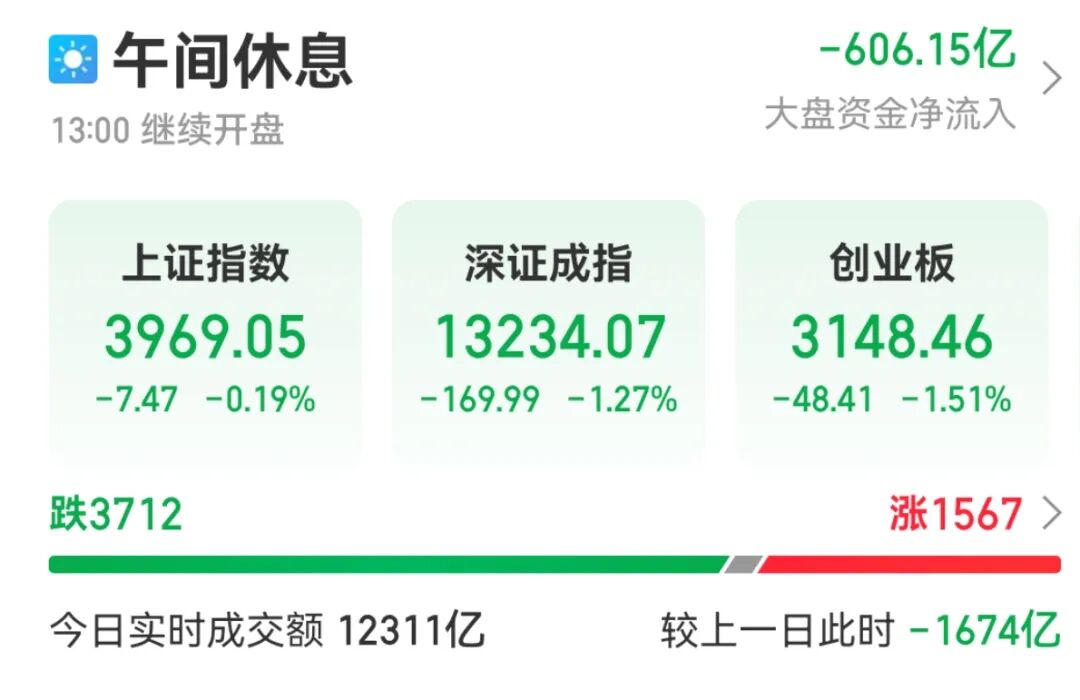 截至上午收盘,上证指数下跌0.19%,深证成指下跌1.27%,创业板指下跌1.51%。