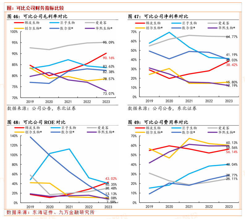 对比同行业公司来看,锦波生物毛利率上升趋势明显,目前已优于大多数同行业公司;净利率同样快速提升,基本处于行业平均水平;ROE则逐步领先同行。(标*为2023Q1-Q3数据)。
