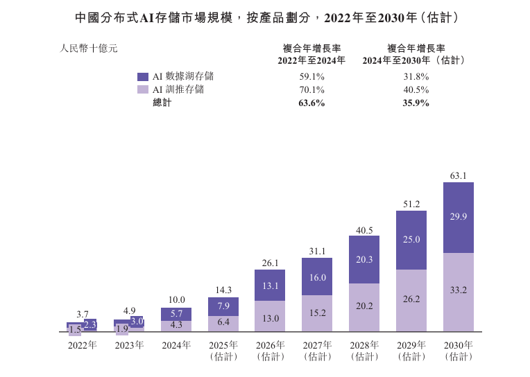 根据灼识咨询,中国分布式AI存储装机量在2024年达到10.3EB,并预计在2030 年扩大至60.5EB,复合年增长率为34.3%。于2024年,AI数据湖存储占市场的约 80%,而AI训推存储占20%。预计以上占比将于2030年分别转为约72%及28%。