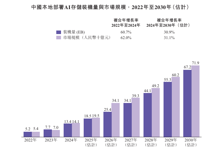 根据灼识咨询的资料,中国本地部署AI存储装机量在2024年达到13.4EB,并预计在2030年扩大至67.2EB,复合年增长率为30.9%。同时,中国本地部署AI存储市场规模在2024年达到人民币141亿元,并预计在2030年增长至人民币719亿元,复合年增长率为31.1%。