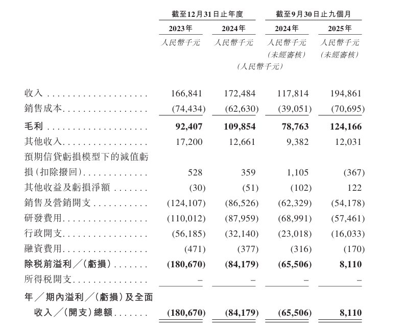 于2023年度、2024年度、2025年截至9月30日止九个月,公司分别录得年/期内溢利约-1.81亿元、-8417.9万元、811万元。