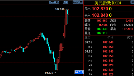 此外黄金小幅上涨,近期暴涨的美元指数继续向103冲击,最新美元指数报102.87.