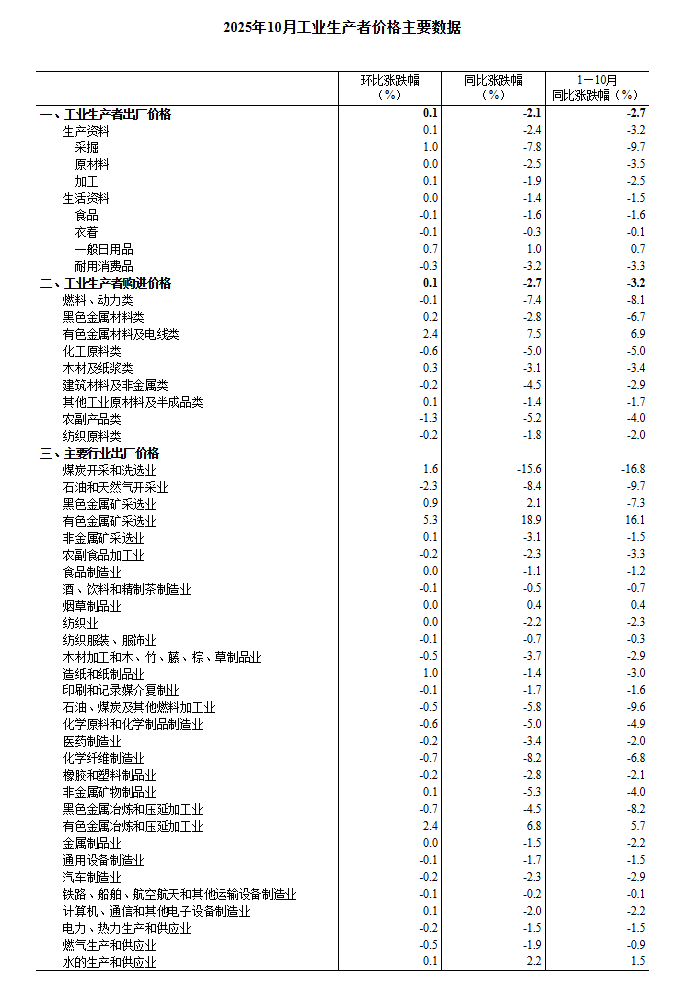 2025年10月份,全国工业生产者出厂价格同比下降2.1%,降幅比上月收窄0.2个百分点;环比由上月持平转为上涨0.1%。工业生产者购进价格同比下降2.7%,降幅比上月收窄0.4个百分点;环比上涨0.1%,涨幅与上月相同。1—10月平均,工业生产者出厂价格比上年同期下降2.7%,工业生产者购进价格下降3.2%。