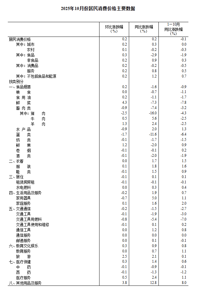 据国家统计局,2025年10月份,全国居民消费价格同比上涨0.2%。其中,城市上涨0.3%,农村下降0.2%;食品价格下降2.9%,非食品价格上涨0.9%;消费品价格下降0.2%,服务价格上涨0.8%。1—10月平均,全国居民消费价格比上年同期下降0.1%。