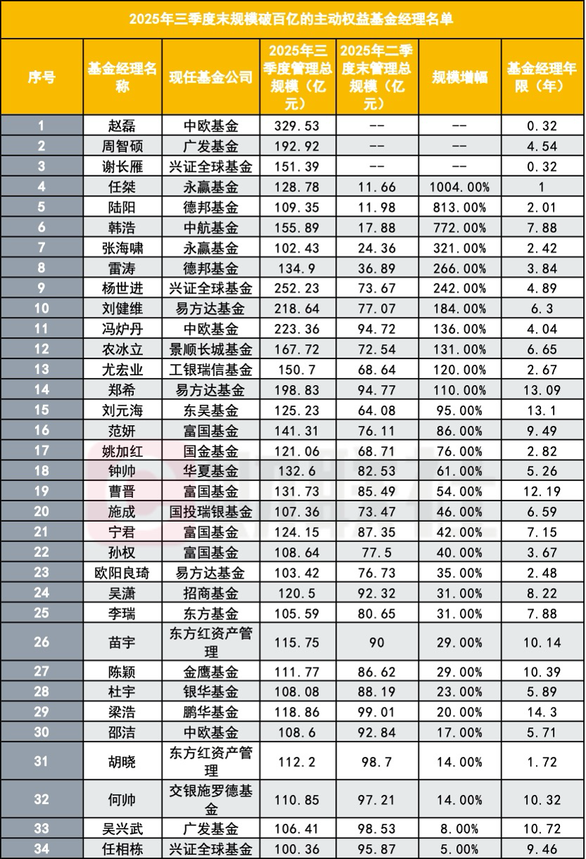 根据公募排排网整理的最新数据,截至2025年三季度末,主动权益领域共有109位基金经理管理规模超过百亿元,较二季度末增加34位(统计时包括了共管规模),刷新年内增幅纪录。与此同时,新晋百亿基金经理中,多人实现单季度管理规模翻倍,一些此前名不见经传的后起之秀开始浮出水面。