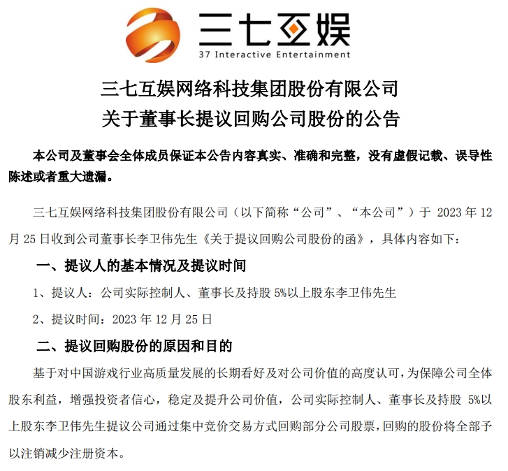 三七互娱公告,公司实际控制人、董事长及持股5%以上股东李卫伟提议公司通过集中竞价交易方式回购部分公司股票,回购的股份将全部予以注销减少注册资本。回购股份的资金总额:不低于人民币1亿元(含),不超过人民币2亿元(含)。