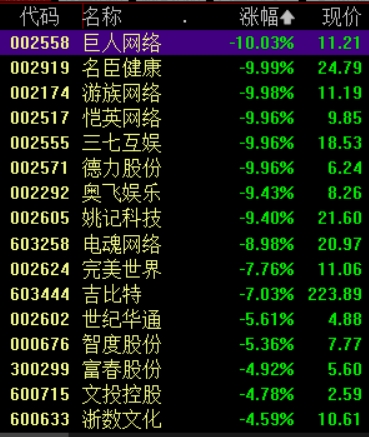 二级市场上,网络游戏板块今日早盘再度大幅下跌 ,截至午间收盘,巨人网络、名臣健康等5股跌停,电魂网络、奥飞娱乐、完美世界等多股跌幅居前。