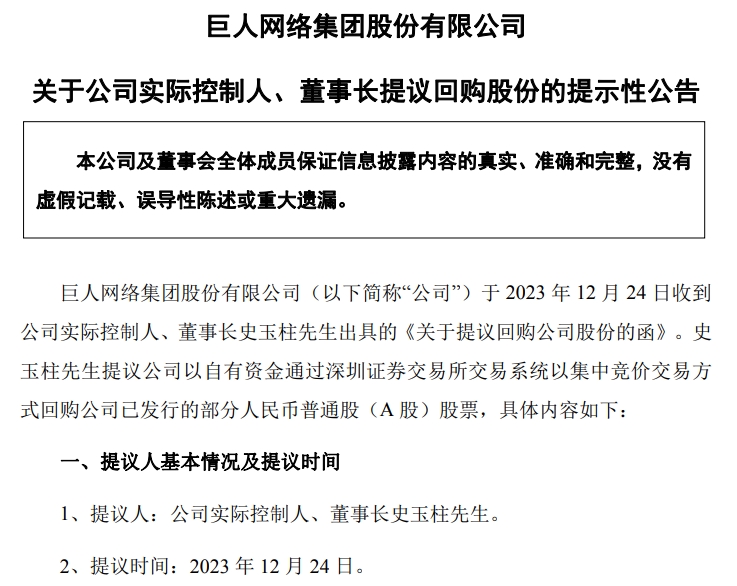 巨人网络公告称,公司实际控制人、董事长史玉柱提议回购1亿元-2亿元公司股份。