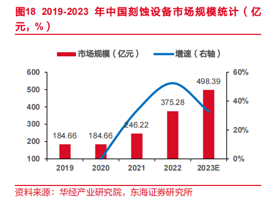 据华经产业研究院统计,刻蚀设备市场规模在各类半导体设备中增速最高,2011-2021年年复合增长率达16.39%,2022年国内刻蚀设备市场规模375.28亿元,预计2023年有望达到500亿元。