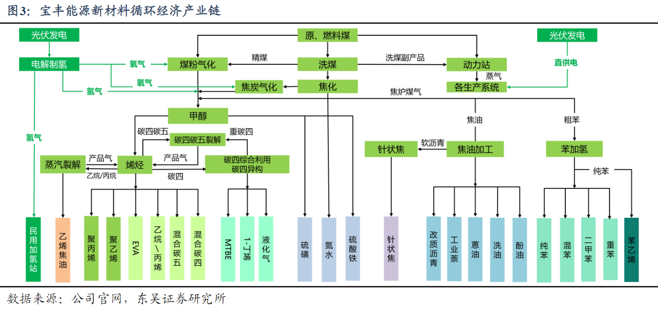 宝丰能源:公司地处国家级宁东能源化工基地核心区,是宁东能源化工基地的重要组成部分,也是最早入驻宁东能源化工基地的骨干企业之一,通过集成国际国内一流的技术及装备,形成了“煤、焦、气、化、油、电”多联产循环经济产业链,实现了煤炭资源由燃料向化工原料的转变及清洁、高效利用,是典型的煤基多联产循环经济示范企业。