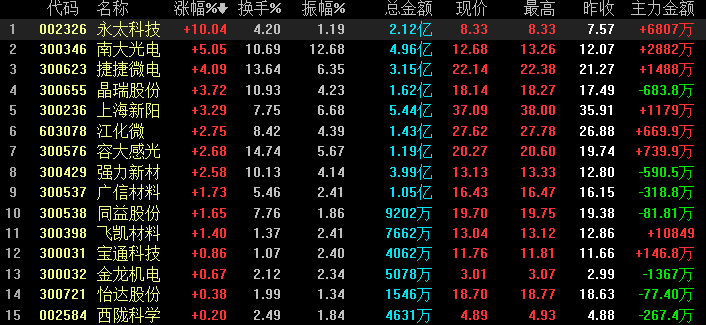 【主题线索】:9月3日,光刻胶概念持续拉升,板块指数涨幅居前,截至收盘,永太科技涨停,南大光电涨超5%,捷捷微电涨超4%,晶瑞股份、上海新阳、容大感光等个股纷纷拉升。