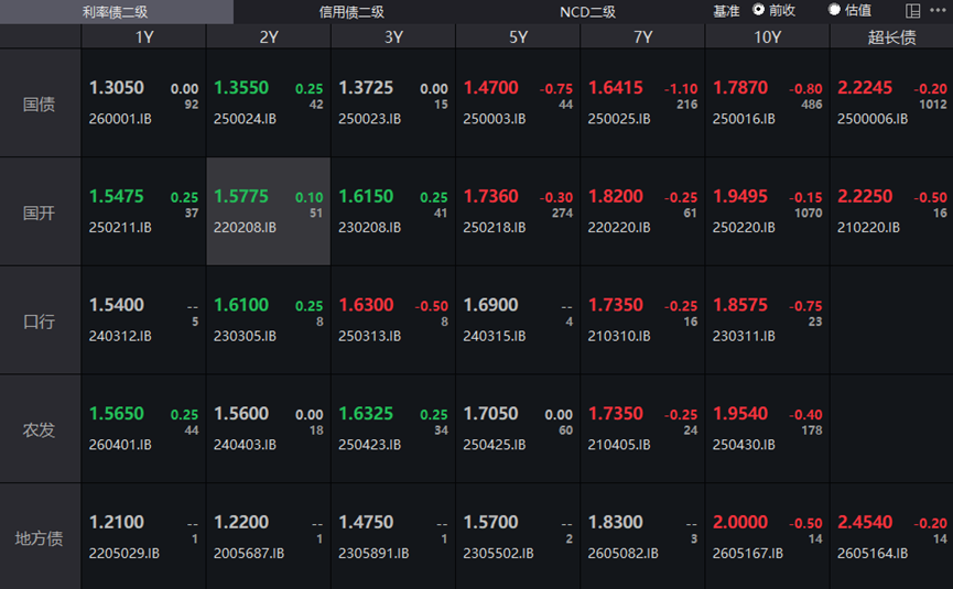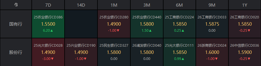 二级存单方面,3M国股成交在1.58%附近,较前一交易日上行1.5bp,1Y国股成交在1.585%位置,较前一交易日下行0.25bp。