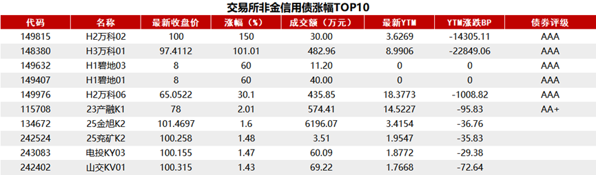 据Choice 数据统计显示,今日交易所市场非金信用债涨幅排行前五的分别是:H2万科02、H3万科01、H1碧地03、H1碧地01、H2万科06。具体如下: