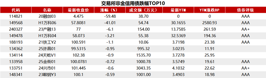 据Choice 数据统计显示,今日交易所市场非金信用债跌幅排行前五的分别是:20融创03、H1万科06、23产融13、H1万科04、21铁工Y2。具体如下: