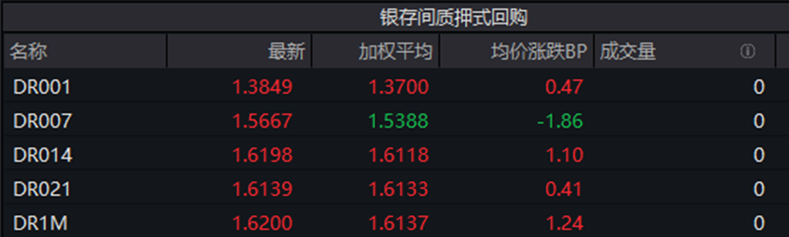 银行间回购定盘利率多数上涨。FR001持平报1.49%;FR007涨2.0个基点报1.62%;FR014涨1.0个基点报1.65%。