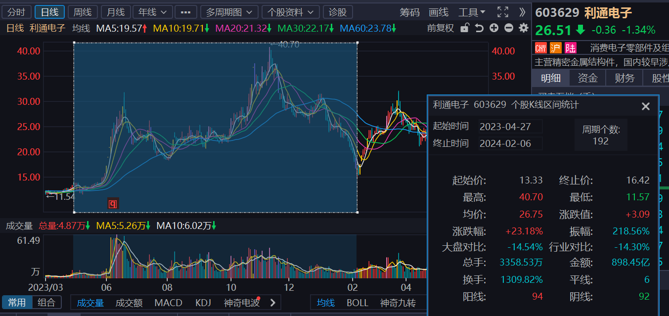 在2023年12月21日至2024年1月2日,8个交易日累计上涨16.72%,但在随后约1个月时间股价腰斩,自2024年1月3日至2月6日,利通电子25个交易日累计下得46.9%。
