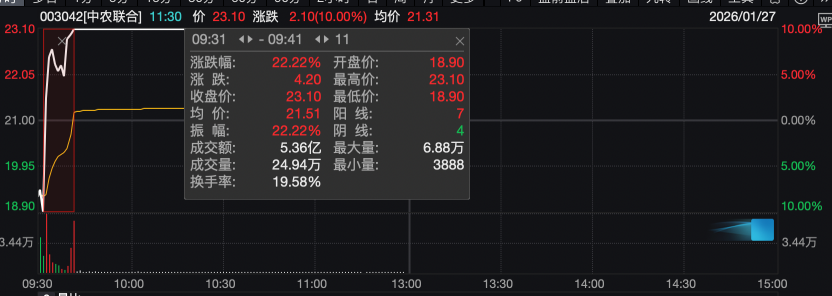 异动个股方面,中农联合(003042)盘中上演“地天板”。具体来看,今日,中农联合大幅低开,随后迅速走低触及跌停,9:31后,公司股价大幅拉升走高,在11分钟内涨停,上演“地天板”。Wind数据显示,中农联合半日成交额达6.6亿元,已超昨日全天。