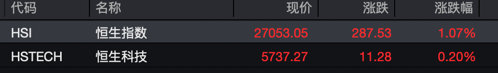 港股市场方面,恒生指数涨超1%,站上27000点整数关口。