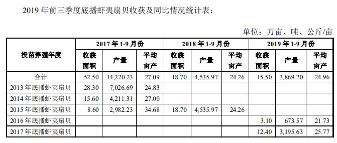 獐子岛称,公司獐子岛区域海洋牧场2019年度可收获的底播虾夷扇贝来源于2016年及2017年投苗养殖的底播虾夷扇贝。獐子岛贴出的数据显示,公司2019年前三季度底播虾夷扇贝收获面积15.5万亩,较受灾前(2017年同期)减少70%、较2018年同期减少17%,2019年前三季度产量3869.20吨,较受灾前减少73%,较2018年同期减少15%。