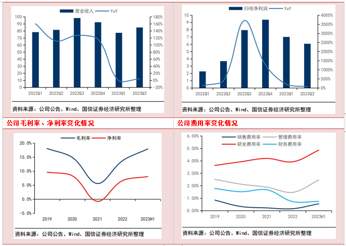 公司2023H1期间费用率同比提升。上半年期间费用率为8.62%,同比+3.04pct;销售/管理/研发/财务费率分别为0.55%(+0.44pct)、2.46%(+1.36pct)、4.86%(+1.36pct)、0.75%(-0.12pct)。