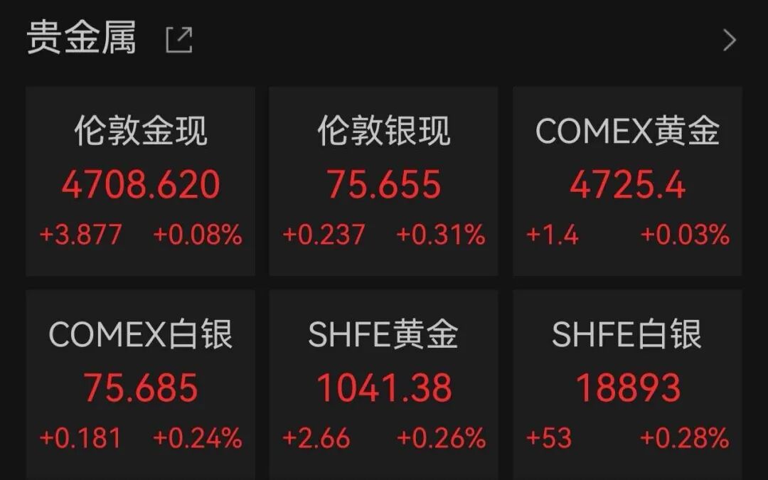 Wind数据显示,当地时间4月24日,国际贵金属期货普遍收涨,伦敦现货黄金涨0.08%,COMEX黄金期货涨0.03%;伦敦现货白银涨0.31%,COMEX白银期货涨0.24%。
