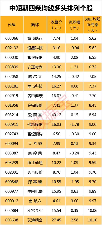 一般来说,均线多头排列代表买方力量强大,后市由多方主导行情概率较大。109只个股5日、10日、20日、60日四条均线近日呈多头排列。其中音飞储存、恒星科技、富奥股份股价与60日均线的乖离率最小,分别为5.62%、5.82%、6.55%。