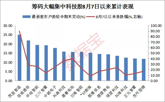 证券时报·数据宝统计显示,剔除今年以来上市新股,与上半年末相比,从最新的股东户数来看,46只科技股股东户数降幅超5%,筹码大幅集中,17家公司股东户数降幅更是超过10%。