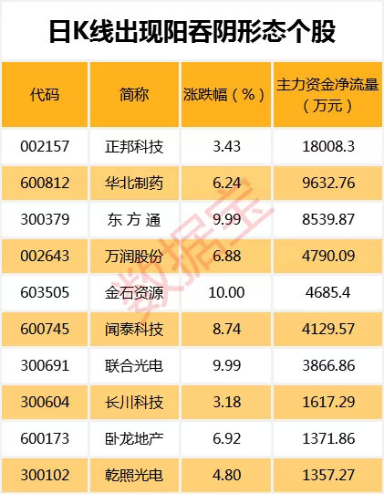 最新数据显示,两市共有31只个股日K线出现阳吞阴形态,当天涨幅最大的是金石资源、东方通、联合光电,涨幅分别为10.00%、9.99%、9.99%。