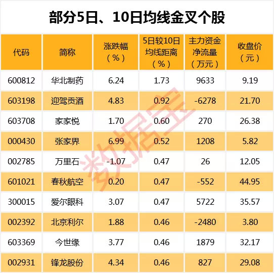 目前有40只A股的5日均线主动上穿10日均线,其中华北制药、迎驾贡酒、家家悦等个股的5日均线较10日均线距离最大,分别达1.73%、0.92%、0.60%。
