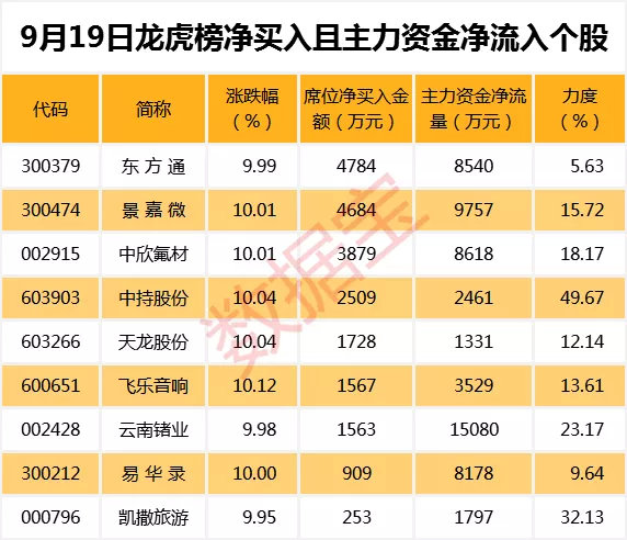 9月19日龙虎榜中机构及营业部席位资金净卖出0.87亿元,其中净买入的个股有17只;净卖出的个股有16只。净买入前三名个股分别是东方通、景嘉微、中欣氟材等,净买入金额占当日成交额比例达3.16%、7.55%、8.18%。