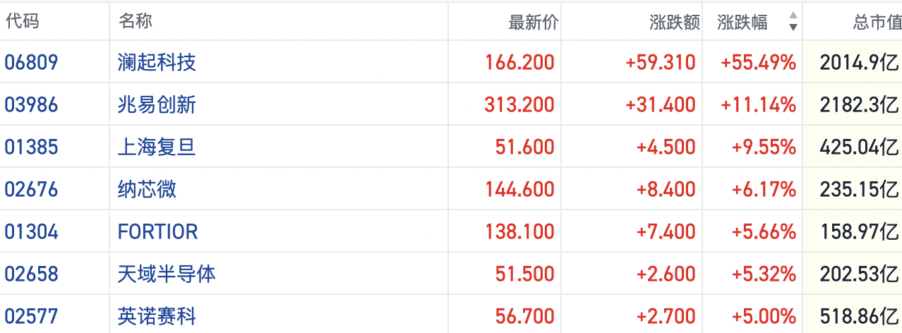 截至发稿,新上市的澜起科技(06809.HK)挂牌首日大涨超50%,兆易创新(03986.HK)涨逾11%,上海复旦(01385.HK)等多只个股跟涨幅度也在5%以上。