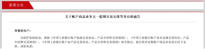 工商银行回应:4月29日,在官方网站滚动播报的“重要公告”栏目发布《关于账户商品业务五一期间交易安排等事宜的通告》,其中第四点向客户说明,“考虑到目前的市场风险及流动性因素,为保护客户利益,我行将根据市场情况,在必要的时候提前对部分产品进行转期或份额调整。”工行还通过网银、手机银行等渠道提前公告转期日,客户在交易界面就能看到。