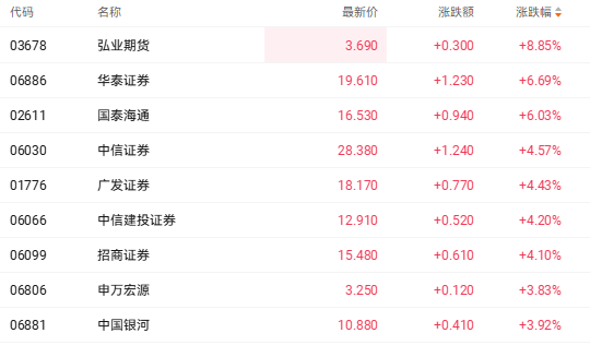 受益周末市场利好,港股券商股表现亮眼。截至发稿,华泰证券(06886.HK)涨6.69%、国泰海通(02611.HK)涨6.03%、中信证券(06030.HK)涨4.57%、广发证券(01776.HK)涨4.43%。
