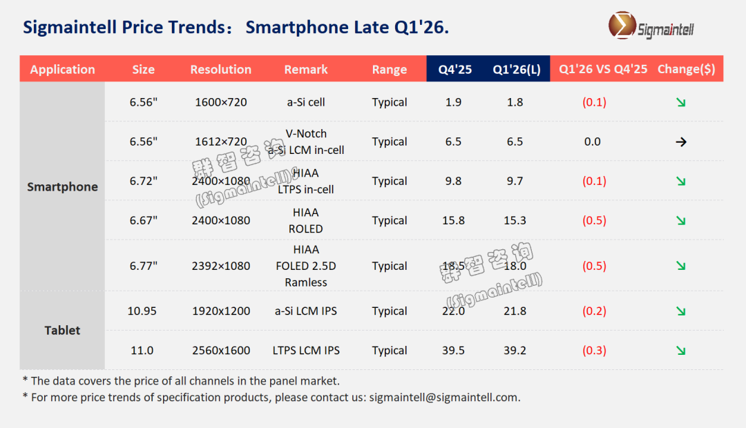 进入 2026 年一季度,智能手机面板市场呈现淡季需求走弱、全技术路线价格承压下行:传统消费淡季叠加上游电子材料成本高企,终端品牌主动控单缩产以缓解经营压力,不同技术路线面板均面临供需偏松的市场环境,价格端呈现普跌态势。